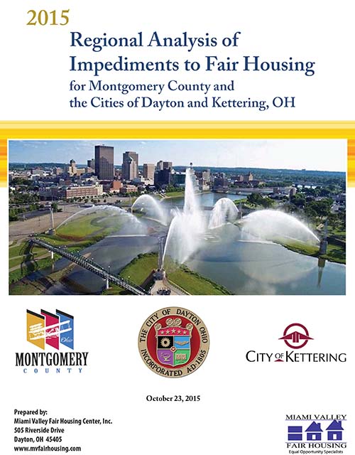 | To view earlier AIs for Montgomery County, Dayton and Kettering, or to view AIs for other jurisdictions, go to our reports page. 2015 Regional Analysis of Impediments to Fair Housing Choice for Montgomery County and the Cities of Dayton and Kettering, OH This 2015 Regional AI—prepared by MVFHC under contract with Montgomery County, the City of Dayton, and the City of Kettering—is a comprehensive review of municipal housing, economic conditions and transportation conditions as well as public and private sector policies to determine whether they support or impede housing choice and opportunities for all persons in the region. Entire document Sections and Appendices Section 1 — Jurisdictional Background Data (PDF — 4 MB) Section 2 — Fair Housing Laws, Research, and Case Law (PDF — 470 KB) Section 3 — Existing Fair Housing Structure (PDF — 864 KB) Section 4 — Fair Housing in the Private Sector (PDF — 1 MB) Section 5 — Fair Housing in the Public Sector (PDF — 2 MB) Section 6 — Public Involvement (PDF — 833 KB) Section 7 — Summary of Findings (PDF — 386 KB) Appendix A — Glossary (PDF — 357 KB) Appendix B — About the Miami Valley Fair Housing Center (PDF — 365 KB) Appendix C — Scope of Services (PDF — 383 KB) Appendix D — Advisory Committee (PDF — 345 KB) Appendix E — Survey Results (PDF — 454 KB) Appendix F — Telephone Interview Questions (PDF — 417 KB) Additional materials referenced in the AI Section 1 — Jurisdictional Background Data An environmental scan of the Montgomery County safety net (PDF — 16 MB) Montgomery County Community Needs Assessment (PDF — 7 MB) Racial Wealth Inequality at the Metropolitan Area and National Levels: Findings and Implications (PDF — 1 MB) Opportunity Mapping: The Geography of Opportunity, Dayton, Ohio (PDF — 1 MB) Notes from Shanahan Community Needs Assessment Panel (PDF — 258 KB) Slides from Community Needs Assessment Panel (PDF — 336 KB) Admissions and Continued Occupancy Policy (PDF — 3 MB) Information regarding Housing Placements for Refugees (PDF — 94 KB) A Second-Generation Disparity Study for the City of Dayton, Ohio (PDF — 1 MB) Section 2 — Fair Housing Laws, Research, and Case Law Fair Housing Trends Report (PDF — 567 KB) Housing Discrimination against Racial and Ethnic Minorities 2012 (PDF — 4 MB) An Estimate of Housing Discrimination against Same-Sex Couples (PDF — 2 MB) ZIP Code Inequality: Discrimination by Banks in the Maintenance of Homes in Neighborhoods of Color (PDF — 20 MB) Are You Listening Now? A National Investigation Uncovers Housing Discrimination against the Deaf and Hard of Hearing (PDF — 5 MB) Where You Live Matters: 2015 Fair Housing Trends Report (PDF — 856 KB) Fair Housing Act Compliance Concerns Arising from Zoning Laws of Jurisdictions within Montgomery County, Ohio, and the Impact upon People with Disabilities (PDF — 135 KB) Section 3 — Existing Fair Housing Structure ConPlans by HUD Region and Field Office 2016–2017 (PDF — 259 KB) Section 4 — Fair Housing in the Private Sector Community Reinvestment Act memorandum (PDF — 395 KB) Accessibility (Design and Construction) Requirements for Covered Multifamily Dwellings under the Fair Housing Act (PDF — 189 KB) The Assessor’s Perspective (PDF — 6 MB) Foreclosures by Race and Ethnicity: The Demographics of a Crisis (PDF — 458 KB) Racial and Ethnic Disparities in 2011 Ohio Mortgage Lending (PDF — 511 KB) Section 5 — Fair Housing in the Public Sector Opening the Door: Why Not in Our Back Yard? (PDF — 73 KB) Zoning and Land Use Discrimination Does Not Pay (PDF — 40 KB) Annual Action Plan 2014 (PDF — 3 MB) Assisted and Public Housing Directory (PDF — 1 MB) Second Program Year Action Plan (PDF — 1 MB) Creating Redevelopment Opportunities for Our Communities (PDF — 1 MB) Property Policy Guidelines (PDF — 136 KB) 2012 Five Year Plan (PDF — 25 MB) Section 6 — Public Involvement Data from 2015 AI focus groups and town hall meetings (ZIP archive — 727 KB) 2015 AI focus group questions (PDF — 409 KB) 2015 AI town hall questions (PDF — 385 KB)