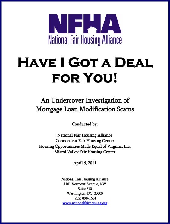 | MVFHC, in collaboration with NFHA and partner agencies, releases report on mortgage loan modification scamsApril 6, 2011 — The Miami Valley Fair Housing Center (MVFHC), in conjunction with the National Fair Housing Alliance (NFHA) and two other NFHA member agencies, has completed a year-long investigation of the mortgage modification and foreclosure prevention industry, releasing today a report entitled “Have I Got a Deal for You! An Undercover Investigation of Mortgage Loan Modification Scams.” With funding from the Department of Housing and Urban Development through its Fair Housing Initiatives Program, MVFHC, NFHA, the Connecticut Fair Housing Center and Housing Opportunities Made Equal of Virginia worked collaboratively on a national scam investigation project that examined scamming techniques. From April 2010 through March 2011, the project identified more than 150 companies suspected of being scammers based on information from their websites and initial contact with company representatives. The partner organizations conducted 84 investigations including testing of 80 companies. Don’t be fooled by a mortgage rescue scammer